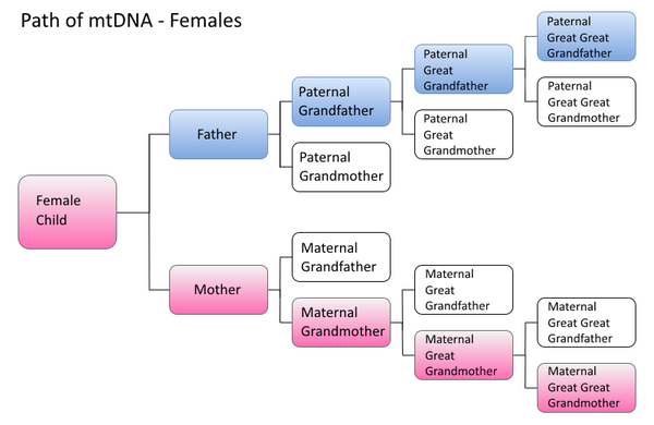 This week, I’m looking in the “other direction” and taking a look at the mothers. On Wednesday, we traced my wife’s maternal ancestry, and today, we will trace the mothers of my mother. This is referred to as the “matrilineal line” and this is the line of descent tested using Mitochondrial DNA (mtDNA). You can learn more about that from the National Human Genome Research Institute or from this very detailed Wikipedia article.