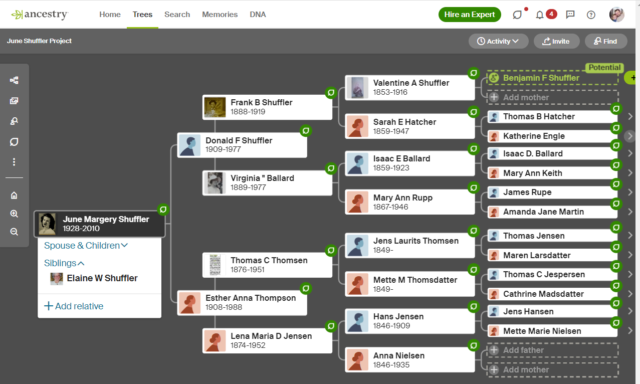 Grandma June (Shuffler) McCullough was my wife’s paternal grandmother – her mother was Esther Thompson, whose lineage of Scandinavian immigrants is sketched out in our 15 November post. June’s paternal line, the Shufflers, were a part of the American Midwest. I owe them a lot more attention, but for today, here’s a snapshot of where we are with our research: