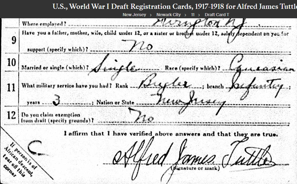 Alfred James Tuttle was the son of John Jackson Tuttle and Florence Mabel Hart, born on 25 Nov 1892 in Rockaway, Morris County, New Jersey. Alfred was the oldest of 12 children, and John supported his large family by working as a machinist and mechanic. During World War I, John worked as a tool-maker for the International Arms and Fuze Company in Bloomfield, New Jersey. Alfred registered for the draft on 5 June 1917 and indicated that he had already served 3 years as a bugler in the New Jersey Infantry.