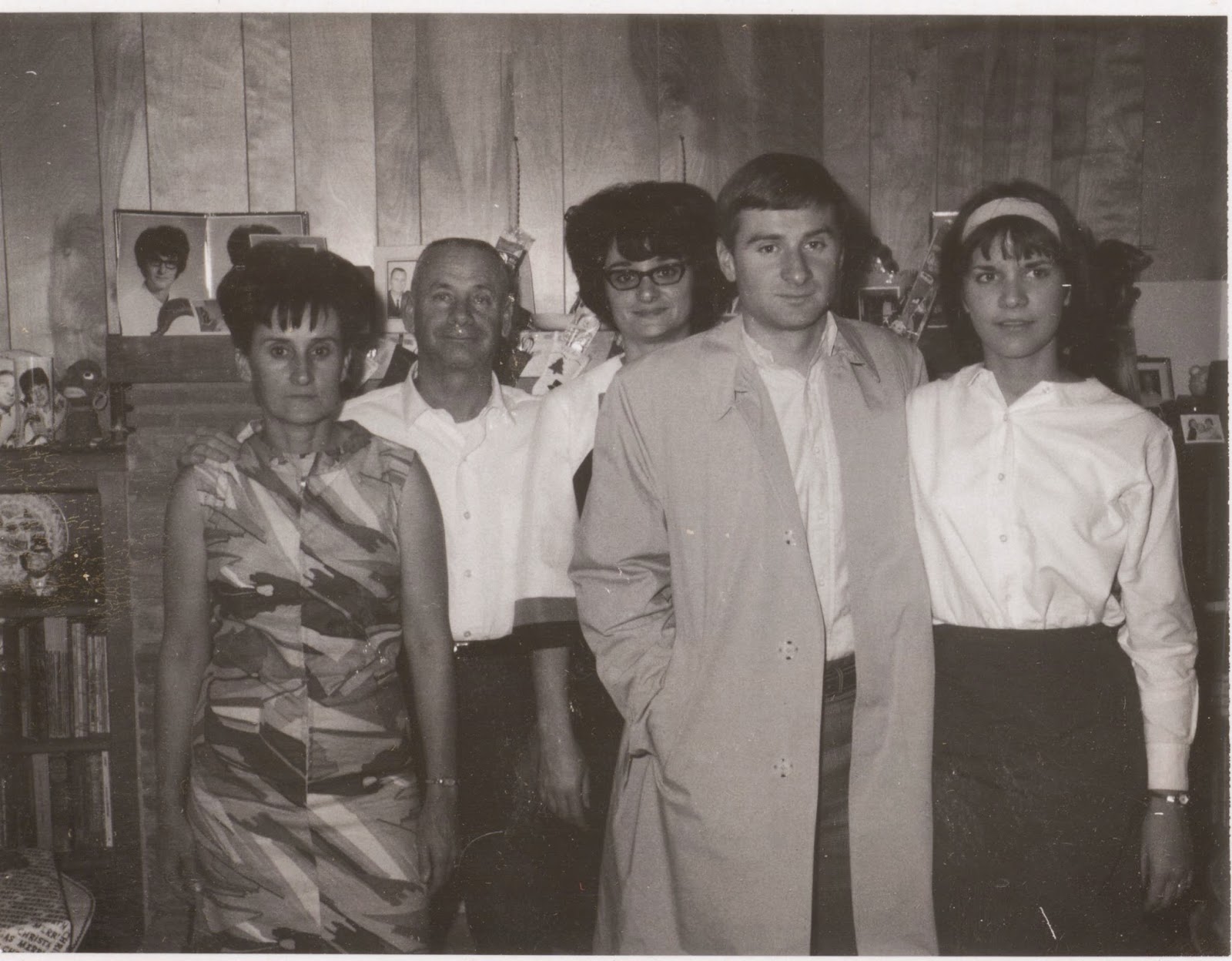 Only Grandpa Dick seems close to smiling here – even the dog looks resigned. Perhaps a later decade with fancy haircuts will improve the mood? Here are Grandma Nancy and Grandpa Bob with my mom and dad (and Aunt Vicki peeking out in the middle).