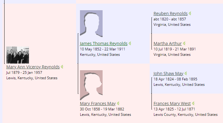 Mary (May) Reynolds was the maternal grandmother of my maternal grandfather, Russ Clark. Her parents were John Shaw May (1824–1895) and Frances Mary West (1825–1871). You may recall that John S. May and his father-in-law, Thomas West, were on opposite sides of the Civil War – I told their story in a guest post on Projectkin: Dangerous Times in Kentucky.