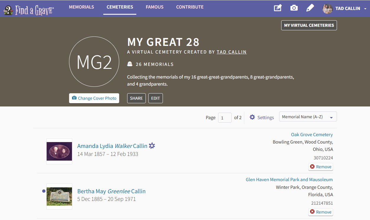 One of the more useful features is the ability to create and curate “Virtual Cemeteries” – which is a collection of memorials that you can use to keep track of your ancestors. Here is my only Virtual Cemetery, for example: