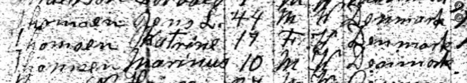 On the following page, three more Thomsen children were recorded as passengers, but without any indication they were part of the Thomsen family: Maren (age 9), Christian (age 6), and Jens (11 months) – all with the surname Thomsen, originating in Gudumland.