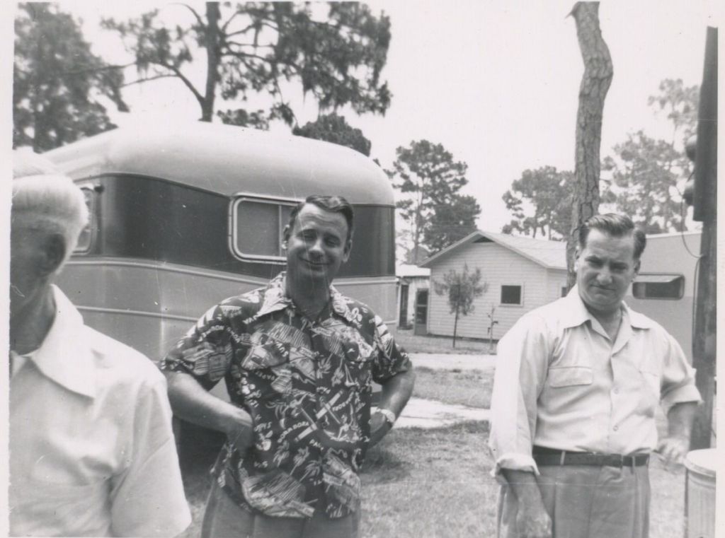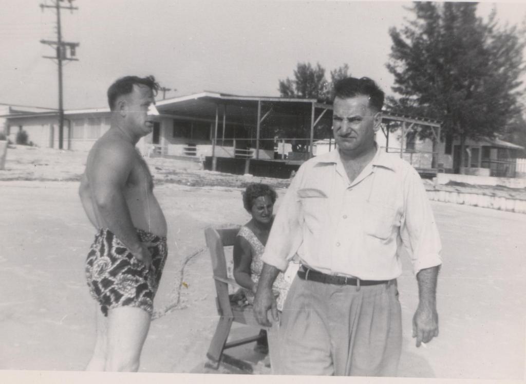 I know that Bob and Norman visited Florida at the same time in the 1950s, because I inherited some photos of them at the beach. In one, you can see their dad, John, just off camera, so that visit must have occurred before 1956. I would guess that both photos were taken on the same day, since Norman appears to be wearing the same shirt in both. (I’ll refrain from comment on Bob’s attire!)