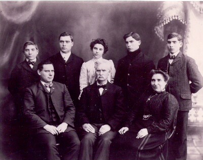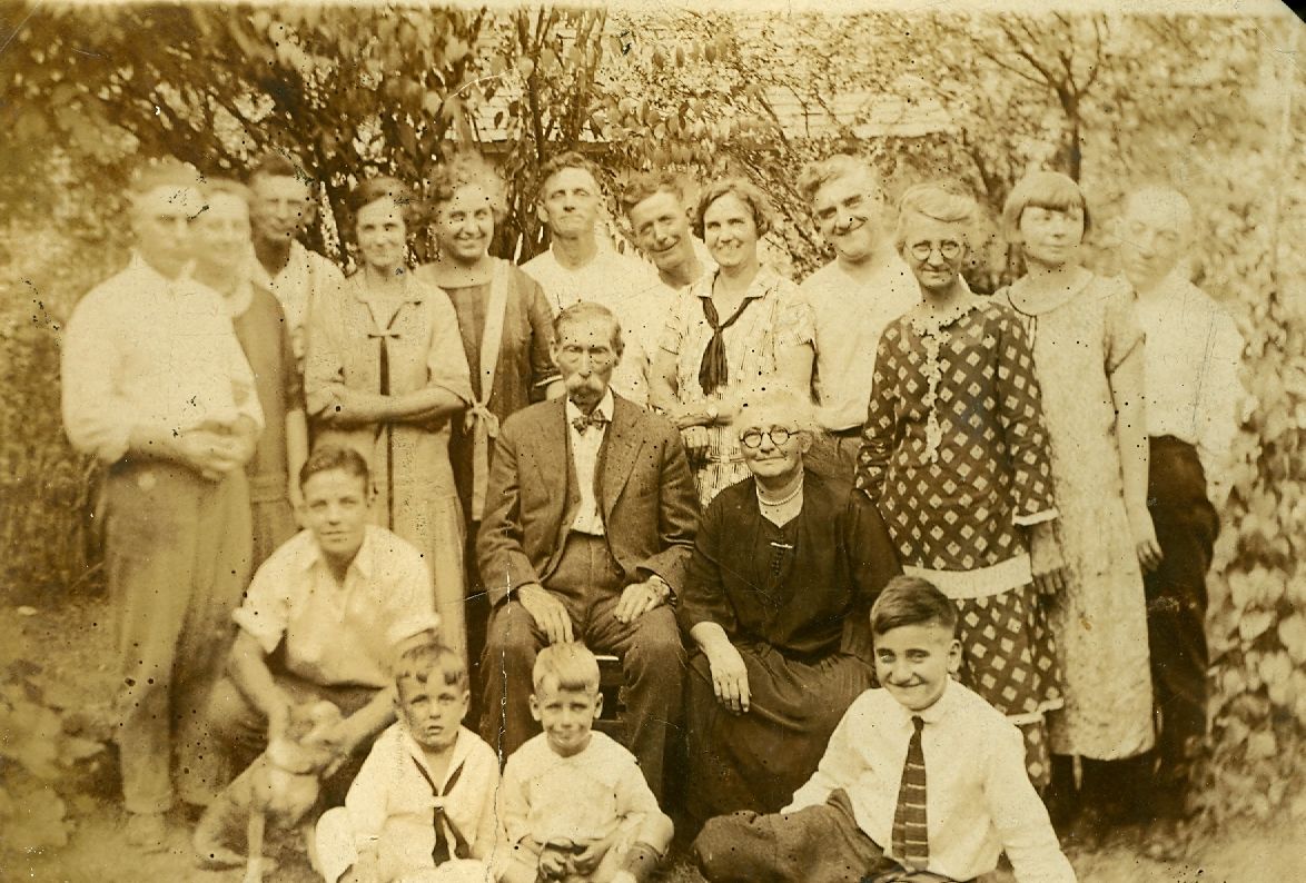 At some point, probably around the time John and Bertha returned to Ohio, they sat for this photo with Bertha’s family. My grandpa Bob is seated in the front, and Norman is on the right, wearing his necktie. John and Bertha appear to be standing on the left; George Cramer is wearing a bow tie and is seated left of Alice. Bertha’s half-sister, Mamie, and her husband, Harlan Richard, are behind Alice, but I don’t know whether Mamie is the lady in the dark dress with the white designs, or the younger lady wearing the dark scarf. The older boy kneeling with the dog on the left appears to be Harry Donald Hale (born 1904), so I would assume his parents, John Harrison Hale and Dora Brookman, are in this photo, too.