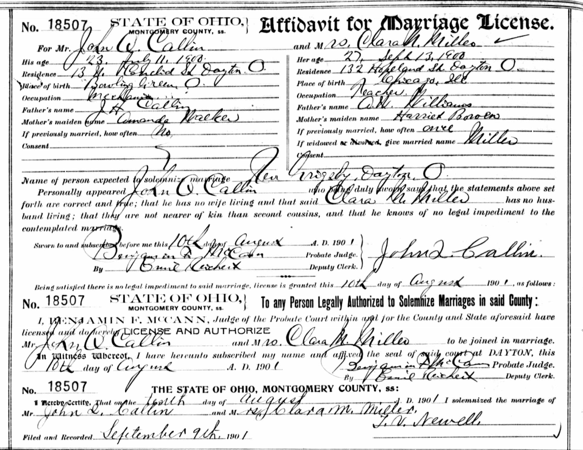 But five years before John married Bertha, he married Clara (Williams) Miller – a teacher from Dayton. With a common name like “John” one might be tempted to dismiss this as someone else’s record, but “John Q.” with parents J.H. Callin and Amanda Walker is a bit more precise: