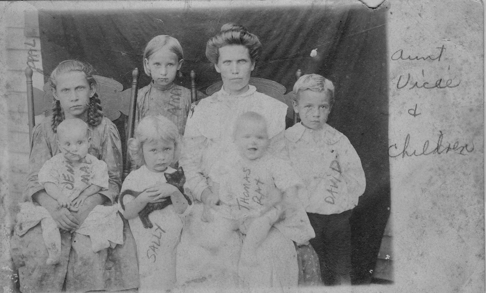 This photo is a recent find for me, and I love it for a lot of reasons. Judging by the age of the twins, Jenny Mae and Thomas Ray, I guess it was taken in 1911. Vicie looks strong, confident, and in charge; the children look like they have been commanded to behave, and the babies seem delighted to be there. I see my cousin Tim’s features in the twins, and his mom, my aunt Judy, in Sally’s face.