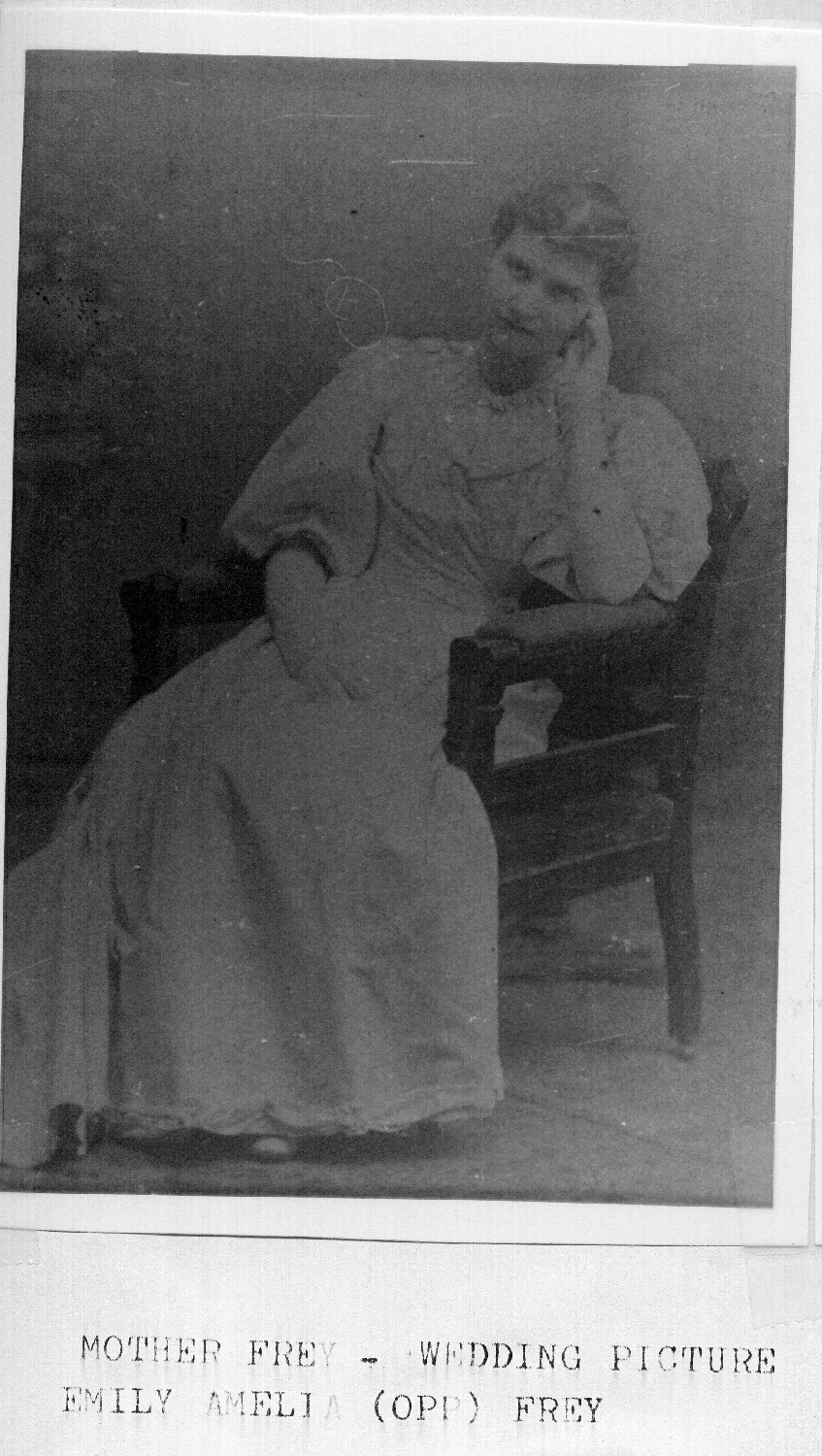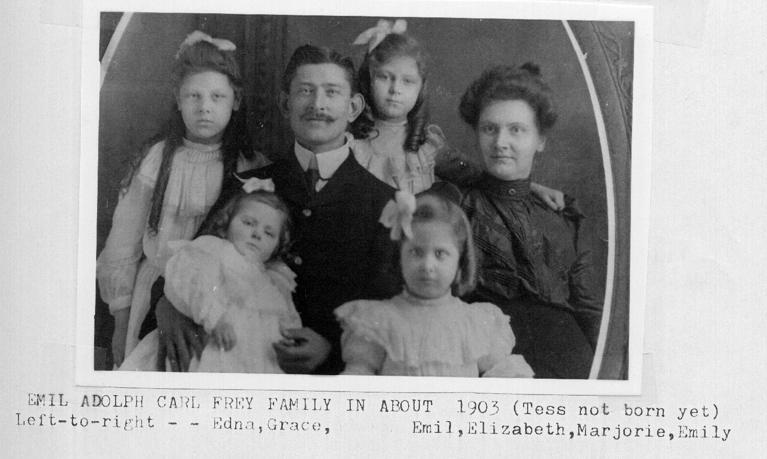 Edna Lyle Frey was the first child born to Emil and Emily Frey after they married in 1893. A sister, Bessie, was born when Edna was two years old. Blanche was born the year after that, followed a year later by Marjorie. At the end of 1900, Blanche died, most likely due to one of the childhood illnesses that ravaged so many families before the advent of antibiotics and vaccination.